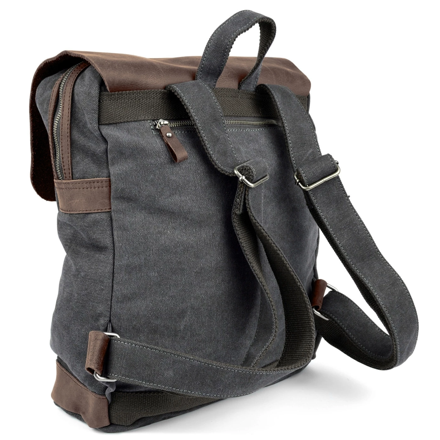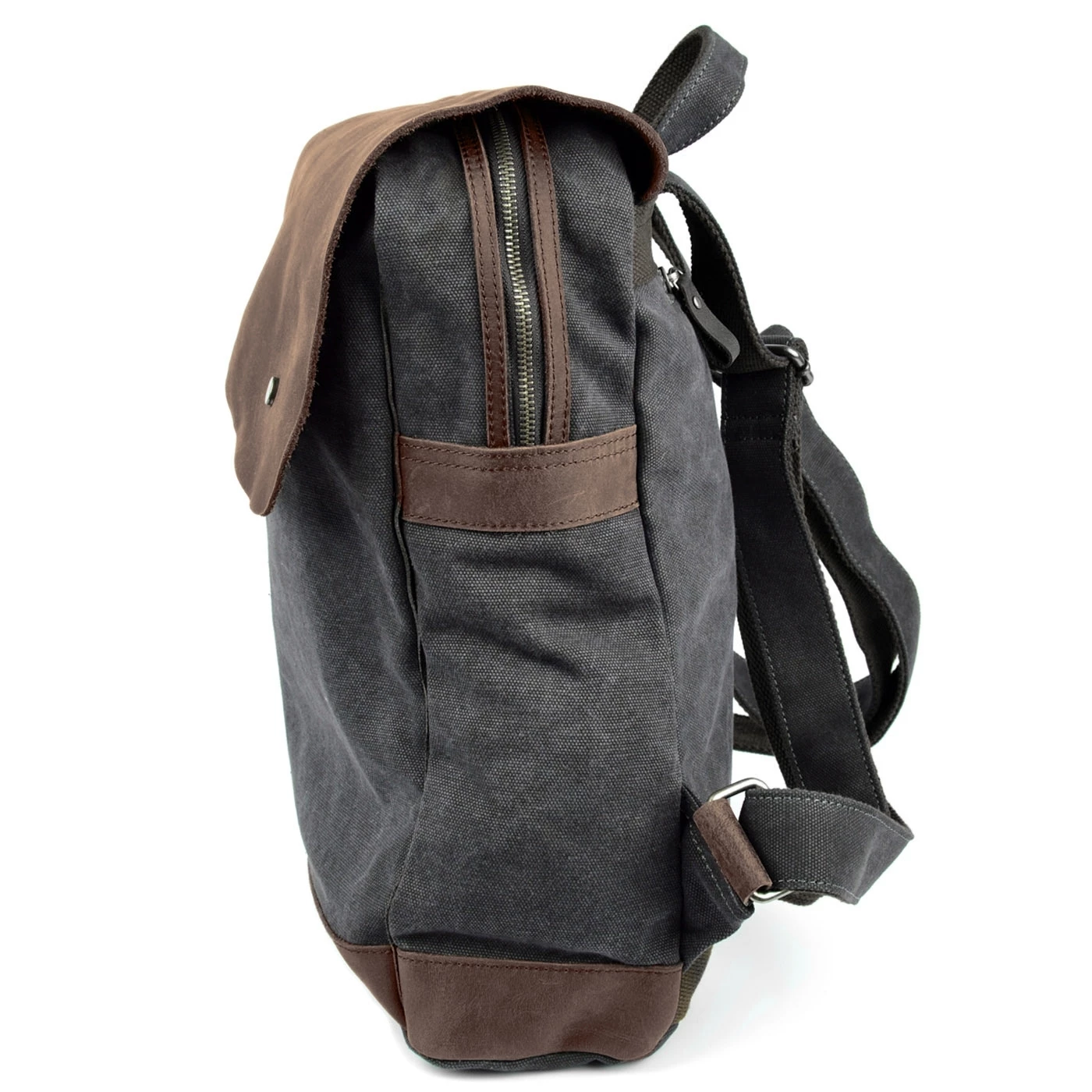 This charcoal gray canvas bag features rustic leather details.