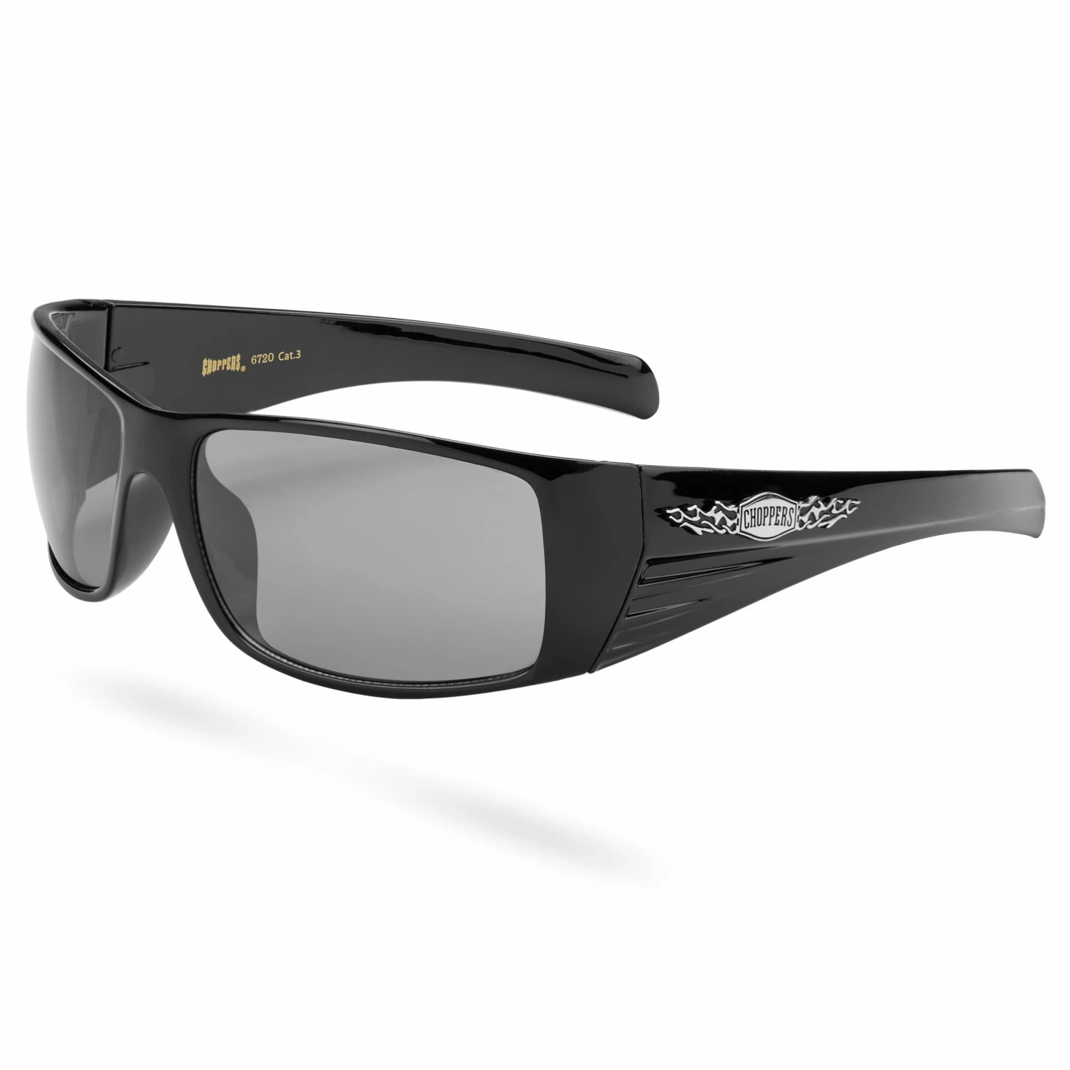 The smoke-colored lenses include UV400 protection that gives complete protection from the sunโs harmful rays, while the thick, glossy black frame and motorcycle-inspired logo provide the style.