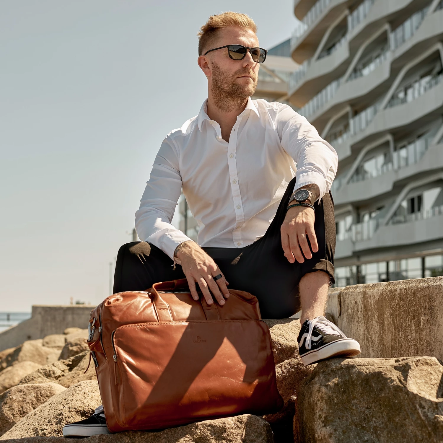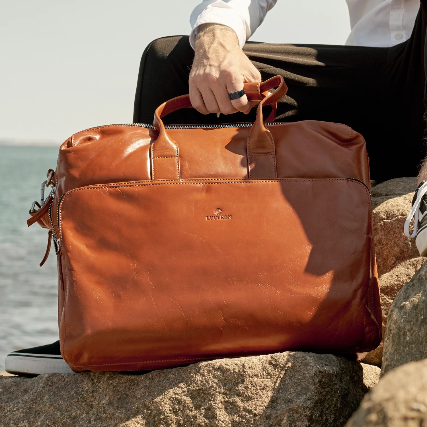 Strong and durable, this leather bag is large enough to carry everything you need when you’re out of the office. Accommodates your laptop in the dedicated compartment, and another computer in one of the double-padded main compartments. The second cotton-lined main section is large enough for folders and books. Integral pockets and pouches hold phones, wallets, and pens.