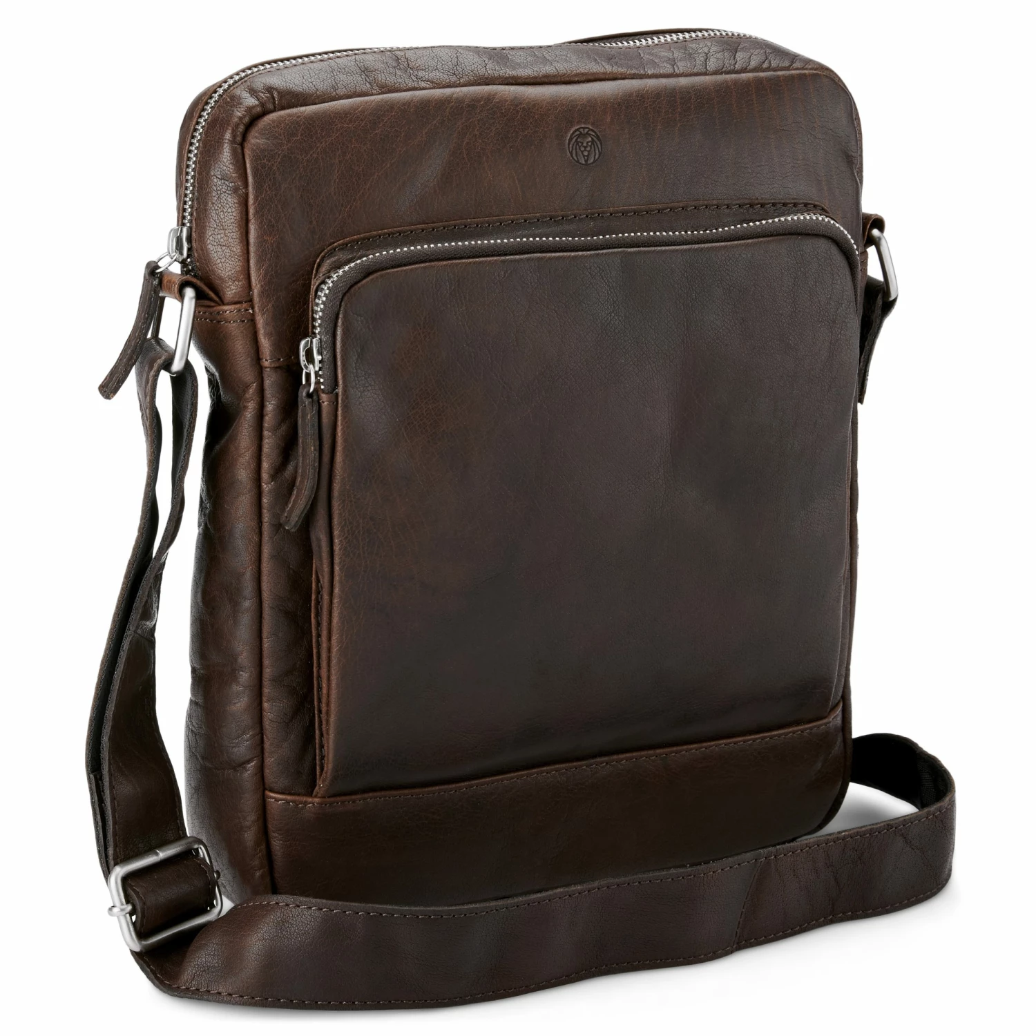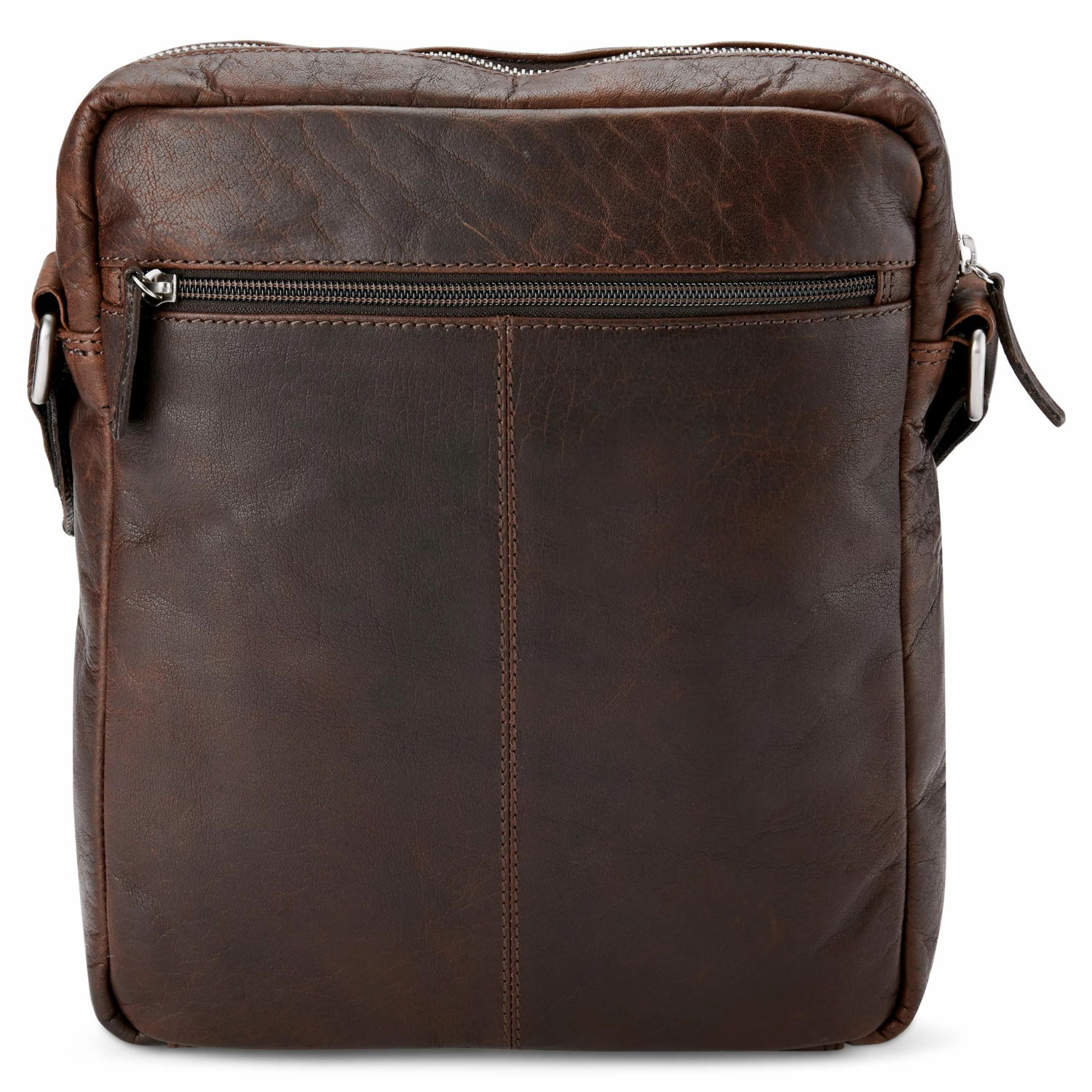 The rustic brown leather obtains a gorgeous patina over time. Hard-wearing YKK zippers ensure a secure enclosure for your belongings. One large zippered pocket is included on the outside and a smaller one on the back. The shoulder strap is conveniently adjustable.