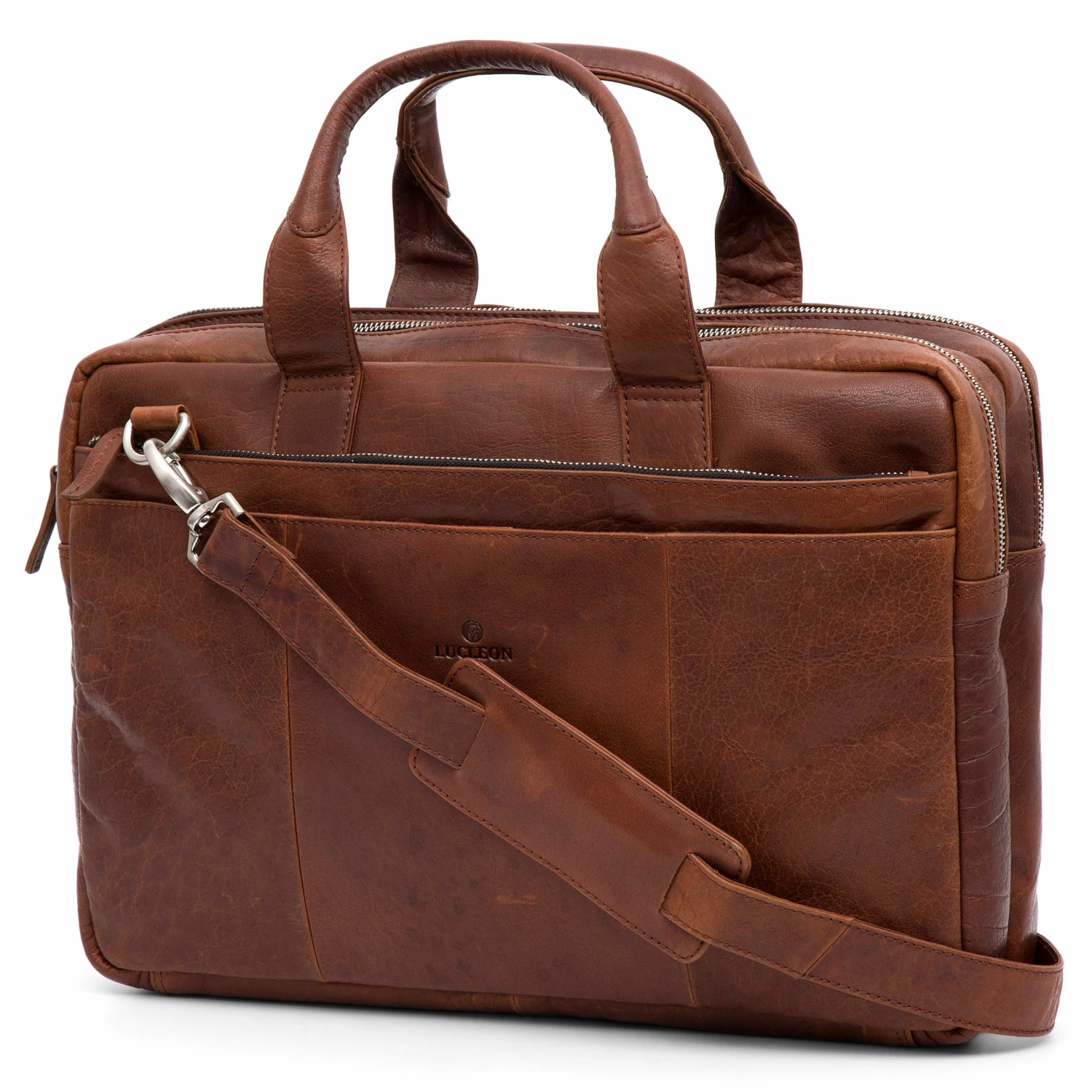 Features carry handles and an easily adjustable and detachable strap. Up front, you get 2 pockets, and 1 at the back. Stay organized with the 2 main zip-lined compartments, dedicated laptop sleeve inside, and 4 slip pouches outside.