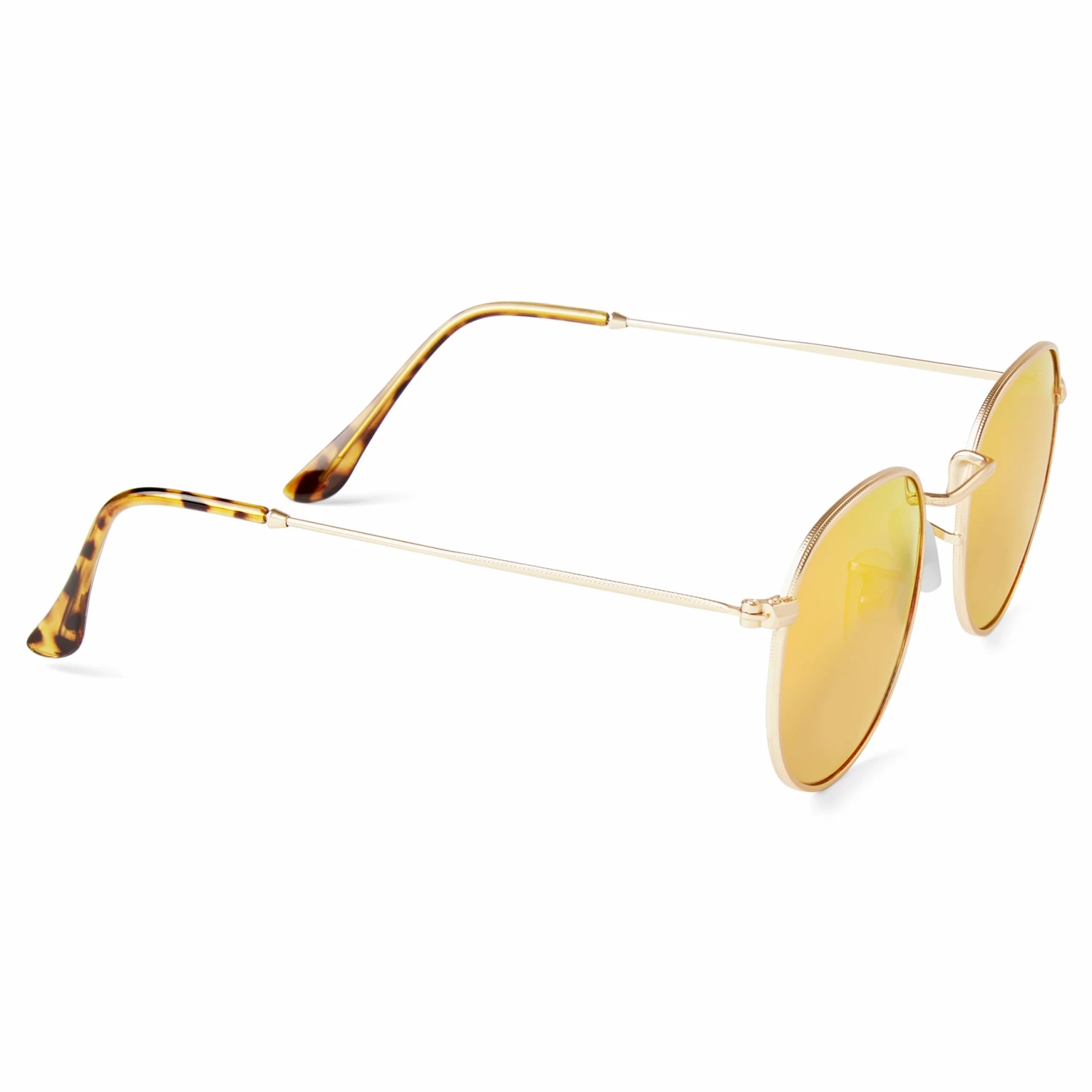 These rounded shades will have you feeling groovy. Gold-toned metal frames and rose-colored lenses make this pair one-of-a-kind. Full eye protection and polarization provided.