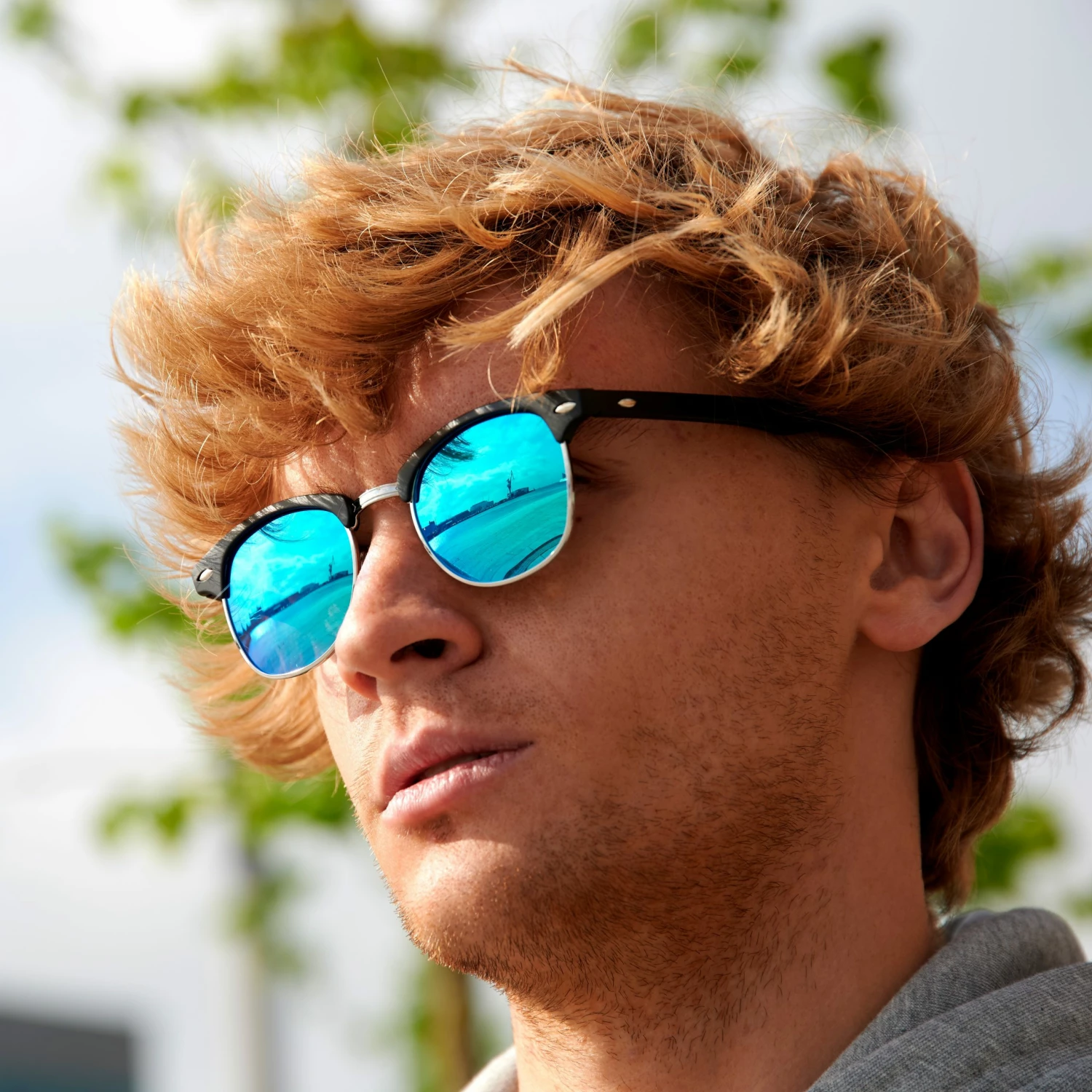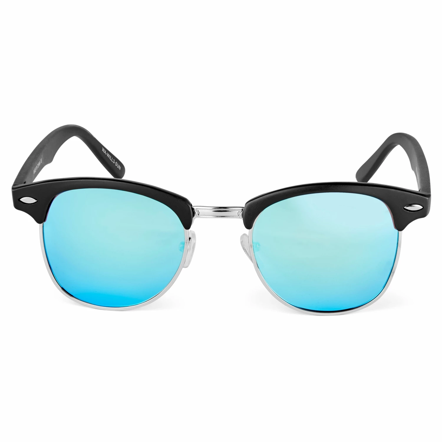 Our browline sunglasses are inspired by the iconic style of the 1950s and updated with blue mirror lenses for today.