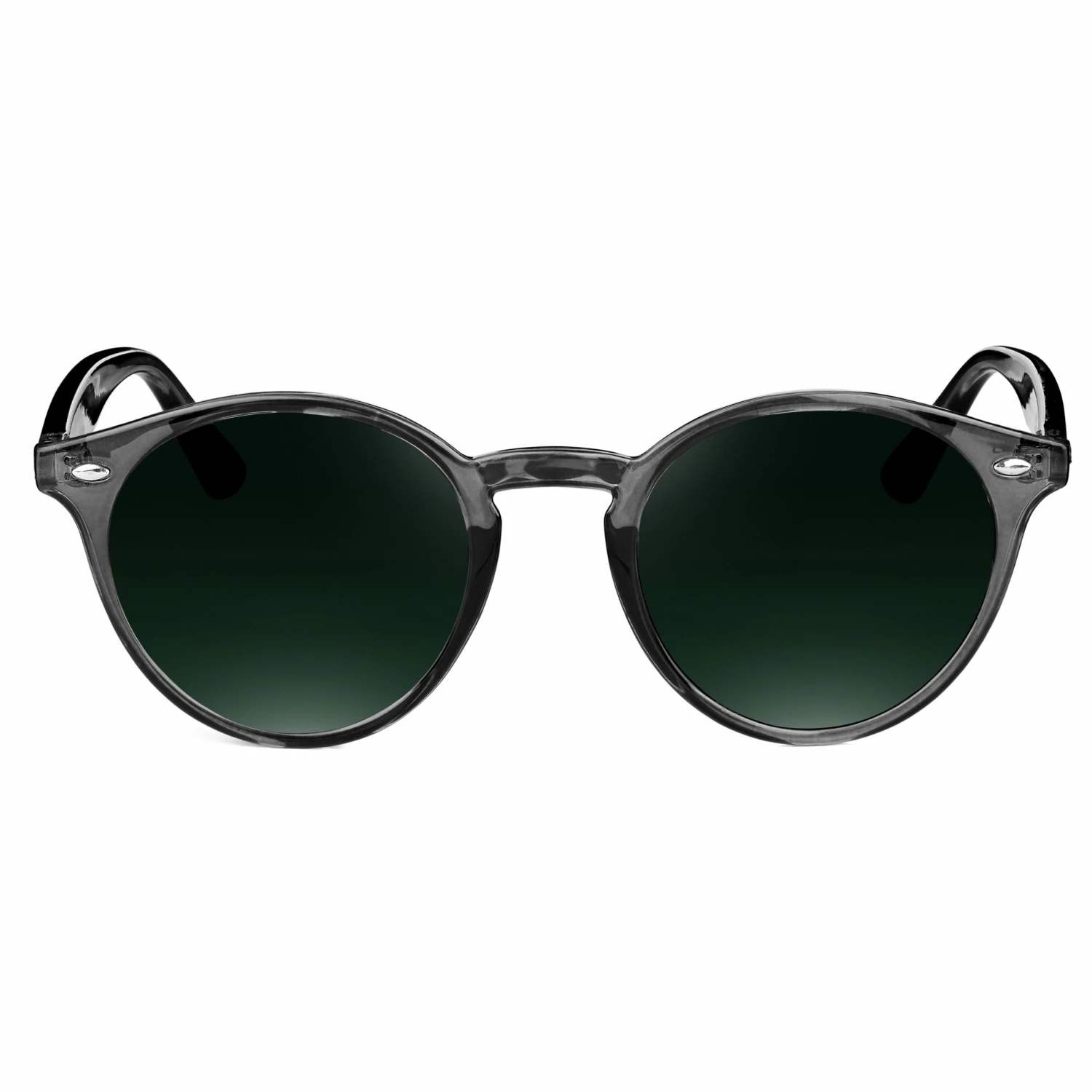 These clear gray sunglasses feature protective polarized lenses that block harmful sunlight.